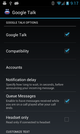 This option enables Enhanced SMS & Caller ID's internal Gtalk client. If you enable this option, you will have to authorize our app to interact with Google's service via the accounts option below. This feature is dependent on Google maintaining the Gtalk feature. Google has said this feature will not be maintained indefinitely.